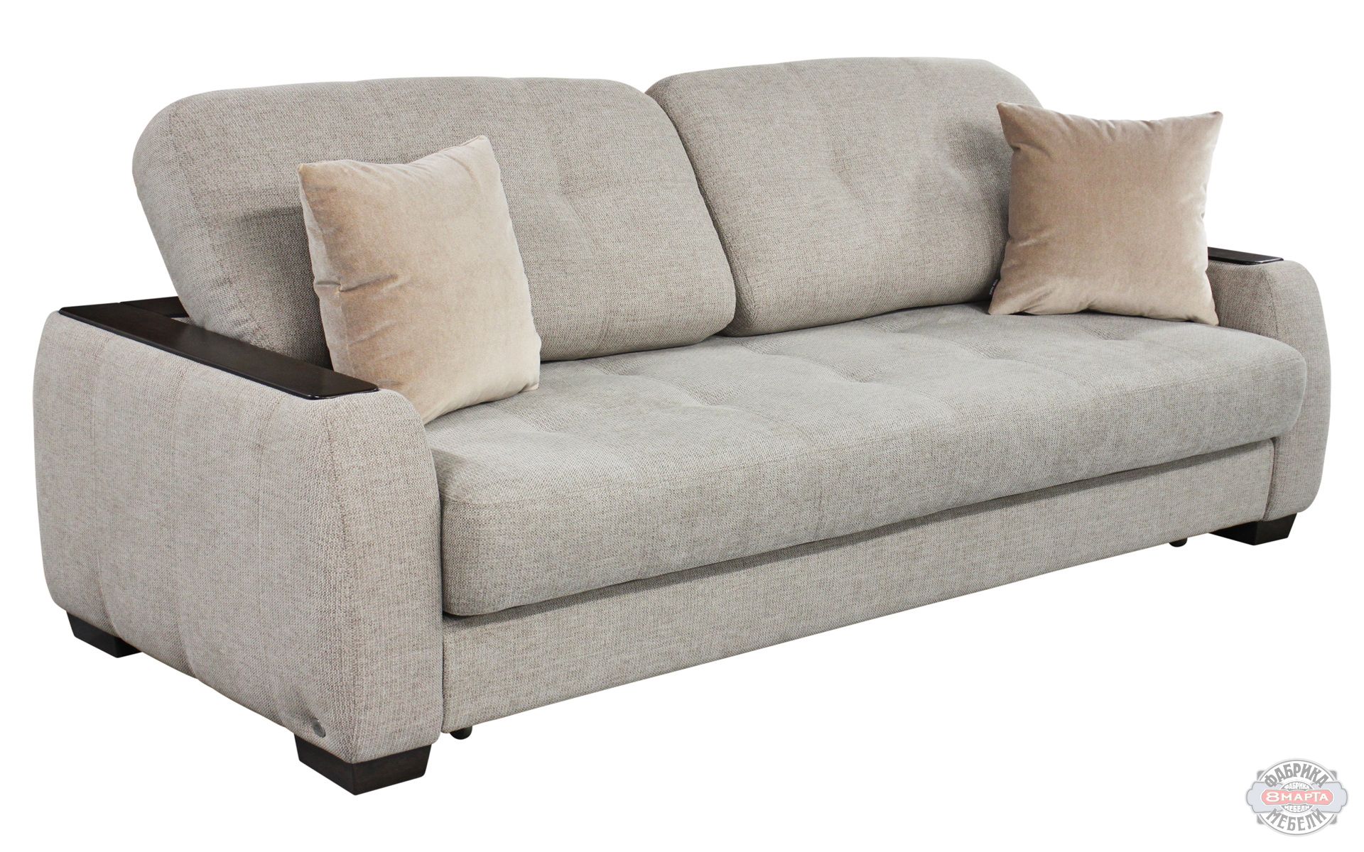 Прямой диван «Флиппер» – мебель, где нет ничего лишнего. Но, несмотря на лаконичный дизайн, модель выглядит стильно и элегантно благодаря утяжкам и мягким формам, а также декоративным накладкам на локотниках и спинке, которые можно использовать в качестве столиков.