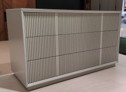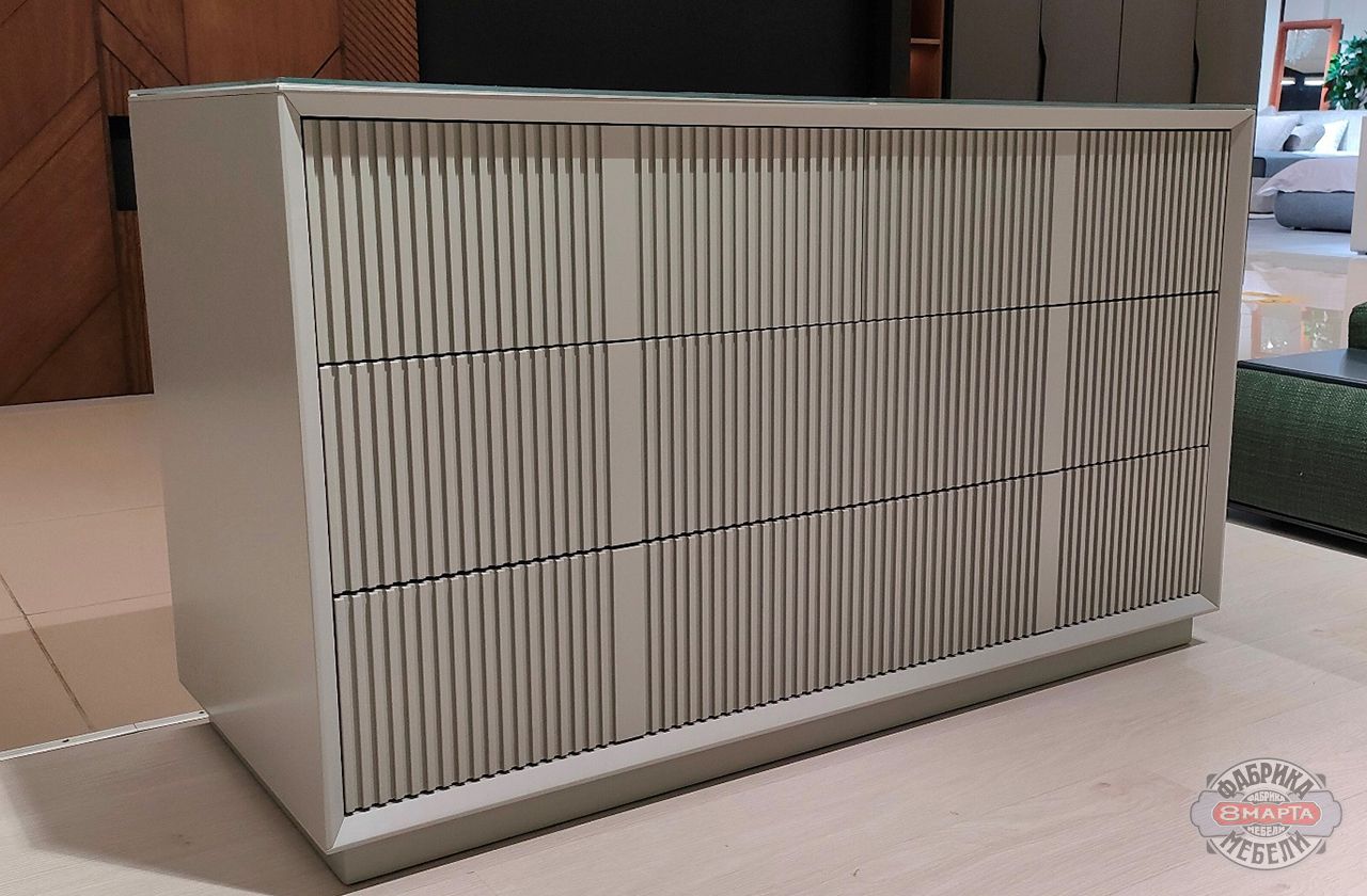 Комод «Одри» привлекает гладкой шелковистой поверхностью корпуса, а также возможностью выбирать разнообразные сочетания цветов корпуса и фасадов выдвижных ящиков, стекла на столешнице. Фасады «Одри» могут также быть выполнены и с вертикальной рифленой фрезеровкой. Она придает предметам выраженную рельефность и создает дополнительный объемный эффект, благодаря чему комод смотрится в интерьере благородно и нетривиально.