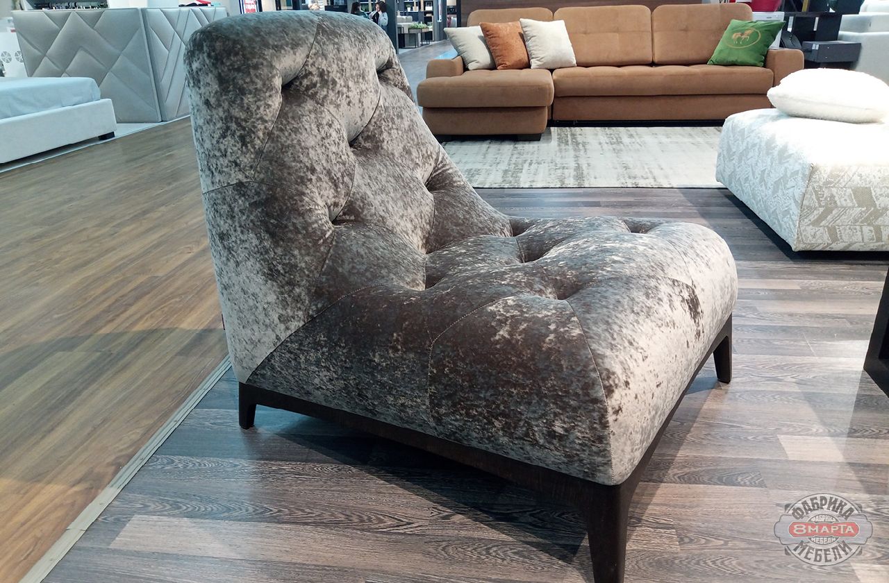 Оригинальное кресло «Люмьер» от фабрики Селекта подойдет для гостиных в стиле неоклассики, модерна, ар-деко. Модель сочетает лаконичные линии и необычные формы: корпус-трапеция переходит в высокие деревянные ножки. За счет отсутствия локотников мебель смотрится легко и изящно. Украшением подушек сиденья и спинки служат глубокие утяжки «пике».