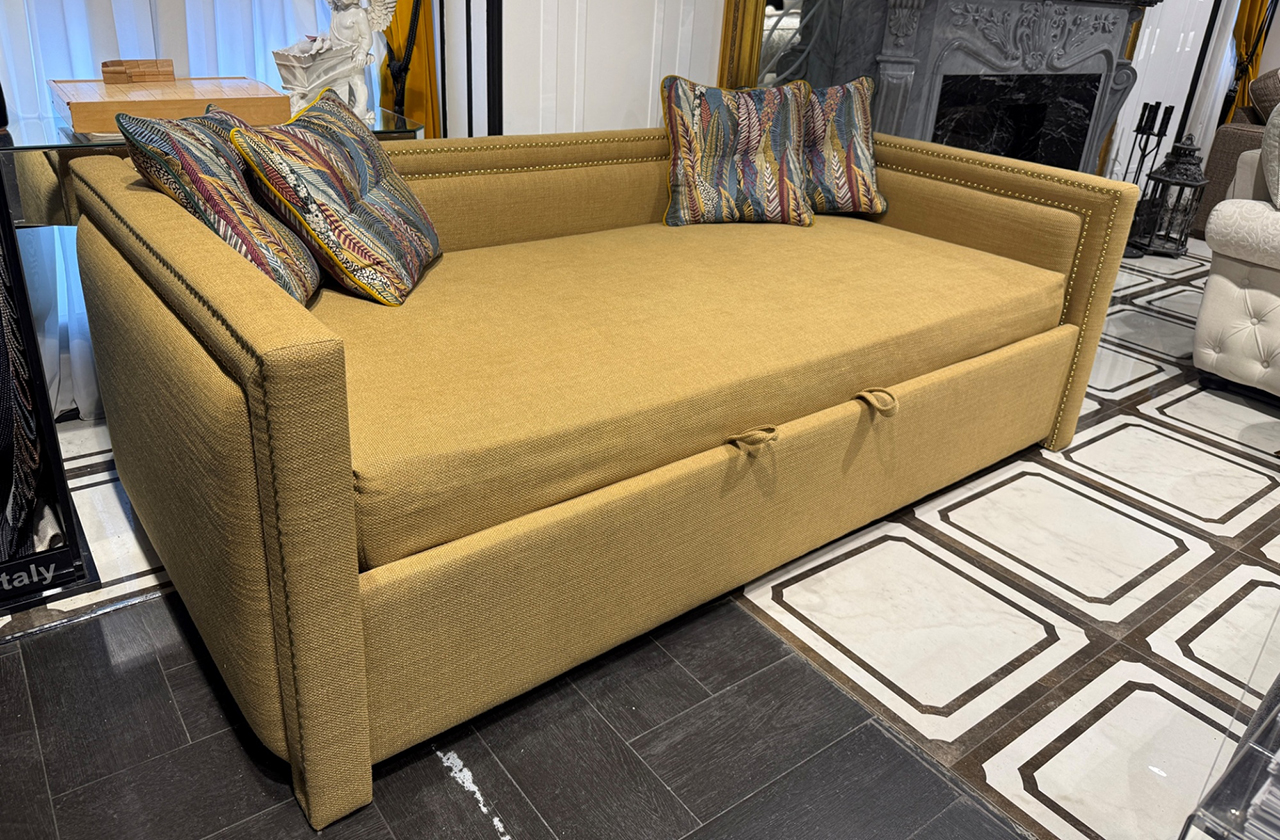 Односпальная кровать «Йорк» — практичная софа в американском стиле для гостиных, детских комнат и гостевых спален. Кровать с прямоугольной спинкой и прямыми локотниками, украшенными декоративными гвоздиками по периметру корпуса, гармонично впишется в любой интерьер. Выберите подходящее оформление — однотонный бархат или велюр, ткань в клетку, материал с цветочным или графическим принтом.