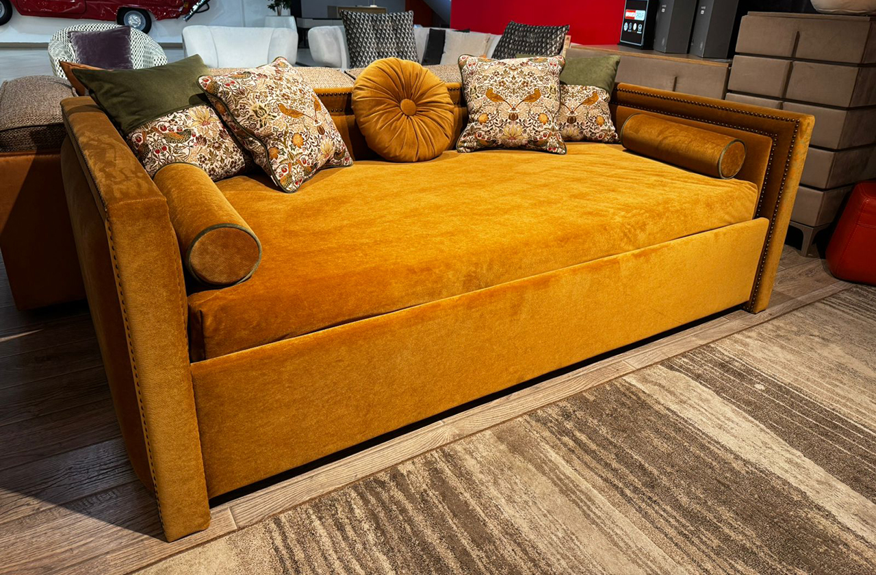Односпальная кровать «Йорк» — практичная софа в американском стиле для гостиных, детских комнат и гостевых спален. Кровать с прямоугольной спинкой и прямыми локотниками, украшенными декоративными гвоздиками по периметру корпуса, гармонично впишется в любой интерьер. Выберите подходящее оформление — однотонный бархат или велюр, ткань в клетку, материал с цветочным или графическим принтом.